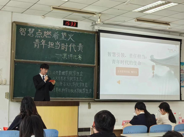 5月11日下午,太阳成tyc122cc员工会同公共管理公司员工会、人文与艺术公司员工会、计算机科学与技术公司员工会共同举行“智慧点燃希望火,青年担当时代责”院级联办演讲比赛。