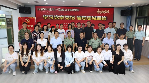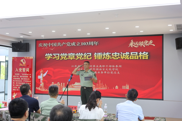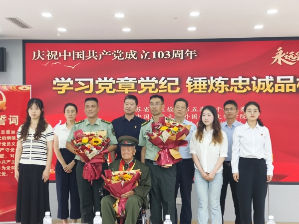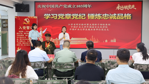 为迎接中国共产党成立103周年,推动党纪学习教育走深走实、入脑入心,6月28日上午,太阳成tyc122cc与校直属业务单位,联合江苏省军区徐州第五离职干部休养所共同举办“学习党章党纪、锤炼忠诚品格”“七一”主题党日活动。参加过抗美援朝战争、荣获朝鲜三级国旗勋章、荣立三等功二次的98岁的离休老干部孙金波,公司党委书记张向东、副书记朱正中及部分员工党员代表,校直属业务单位党总支书记方跃平、副书记尹良伟及部分教职工,江苏省军区徐州第五离职干部休养所所长李新胜、政委唐克伟及部分官兵参加活动。唐克伟主持活动。