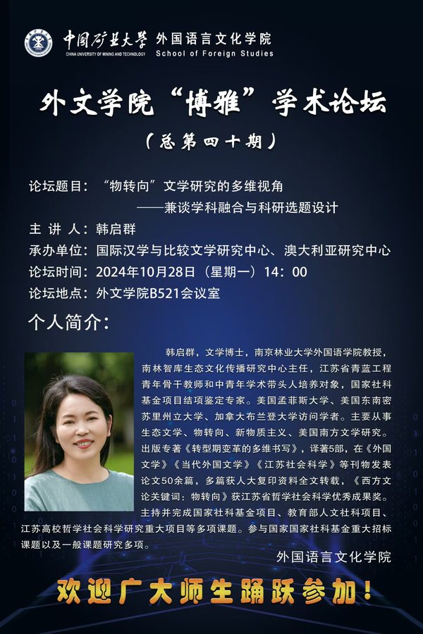 太阳成tyc122cc“博雅”学术论坛(总第四十期)“物转向”文学研究的多维视角——兼谈学科融合与科研选题设计