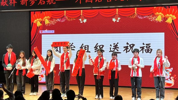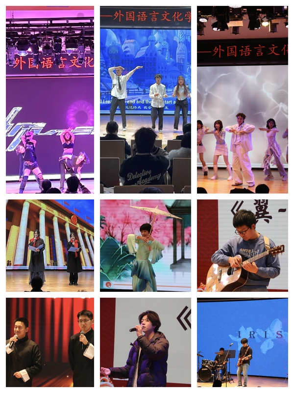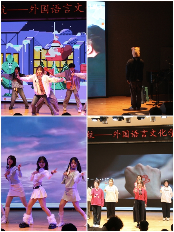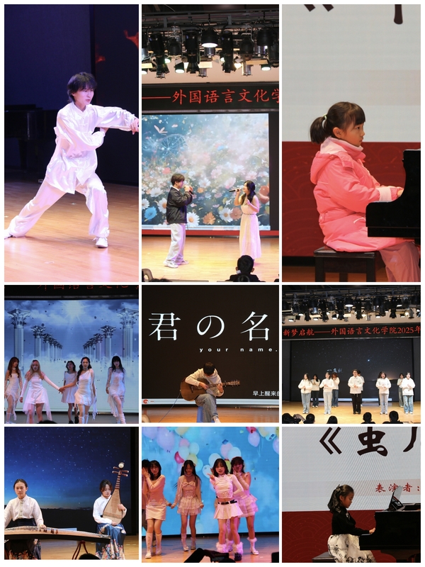 晚会由“华章将启,韵律成诗”“欢歌悦动,新禧同唱”“瑞彩盈年,志启新程”三个主篇章和互动环节、团学组织送祝福环节组成。晚会内容丰富,形式多样,节目涵盖舞蹈、歌曲、诵读、吉他演奏、相声、武术、乐队表演、钢琴演奏、配音、手语操等形式,充分展示了外文学子的才艺与青春活力。子弟们带来的表演充满童趣,活泼可爱,为晚会增添了欢乐。在互动环节,主持人以幽默风趣的风格引导观众参与猜谜语、歌词接龙,现场气氛热烈,同学们积极参与。送祝福环节中,院团委、员工会、研究生会等团学组织负责人依次上台展示由同学们自己制作的贺年卡、春联,并为师生送上新春祝福。