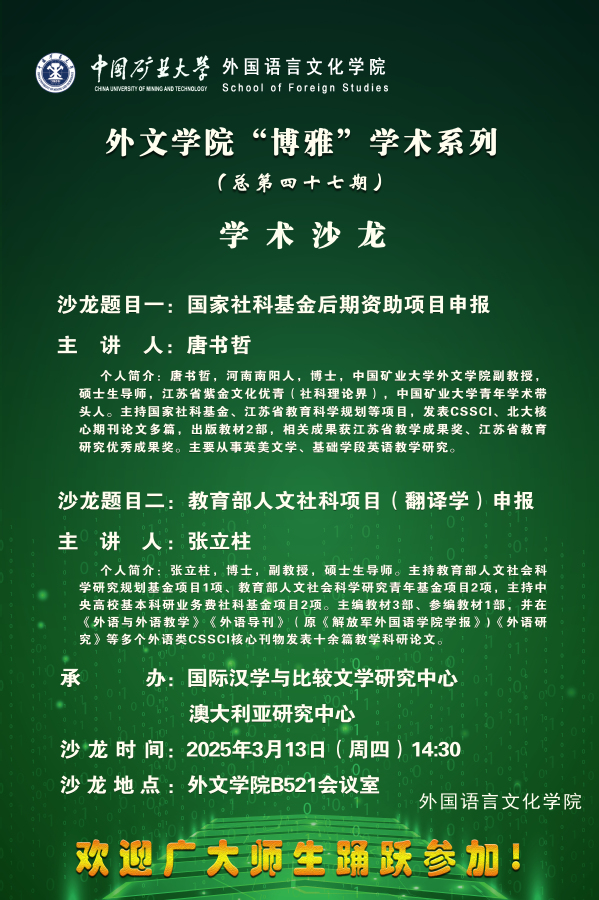 太阳成tyc122cc“博雅”学术系列(学术沙龙)总第47期 --国家社科基金后期资助项目申报、教育部人文社科项目(翻译学)申报