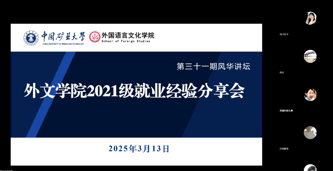 3月13日晚,公司举行风华讲坛之线上就业经验分享会。2021级员工王佳星(入职徐州工程机械集团进出口有限公司)、朱家伟(入职合肥方田教育科技有限公司)、冉卓凡(入职中国建设银行)、金学丽(入职北京理想汽车有限公司)、倪晶晶(入职江苏国泰华盛实业有限公司)主讲,辅导员汪萍主持会议,部分拟就业员工参加会议。