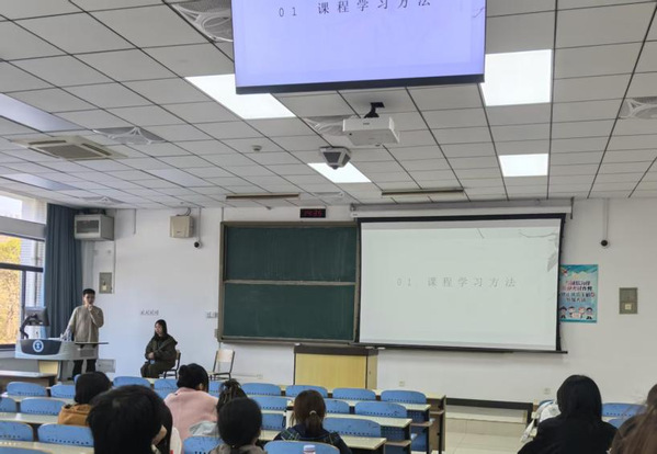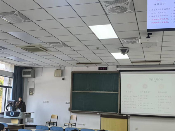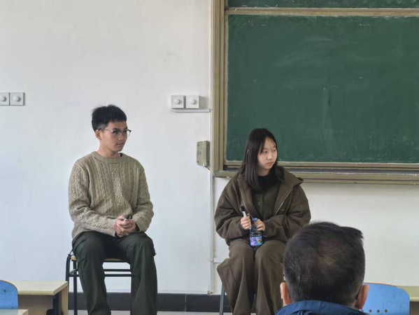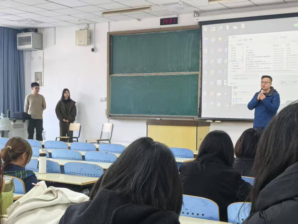 张晴老师向同学们介绍了谢庄祥学长和冯乐学姐,二人已分别被推免至四川大学和上海外国语大学。他们向同学们介绍了自己的学习方法,分享了关于升学和就业的经验,同学们受益匪浅。在问答环节,同学们就保研、考研、就业等方面进行提问,谢庄祥和冯乐认真回答,提出了自己独到的见解。他们强调在日常学习中应打好基础,找准方向,带给了同学们一定的启发。