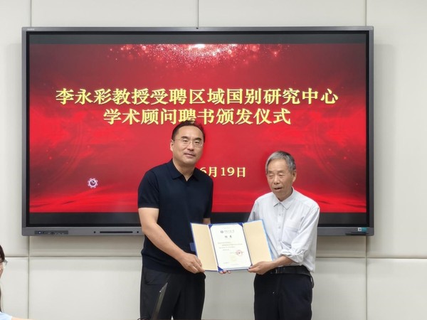 会上举行了李永彩教授担任区域国别研究中心学术顾问聘任仪式。祖大庆为李永彩老师颁发聘书。