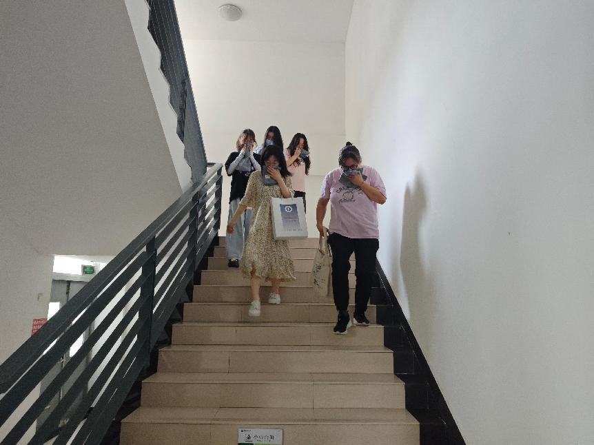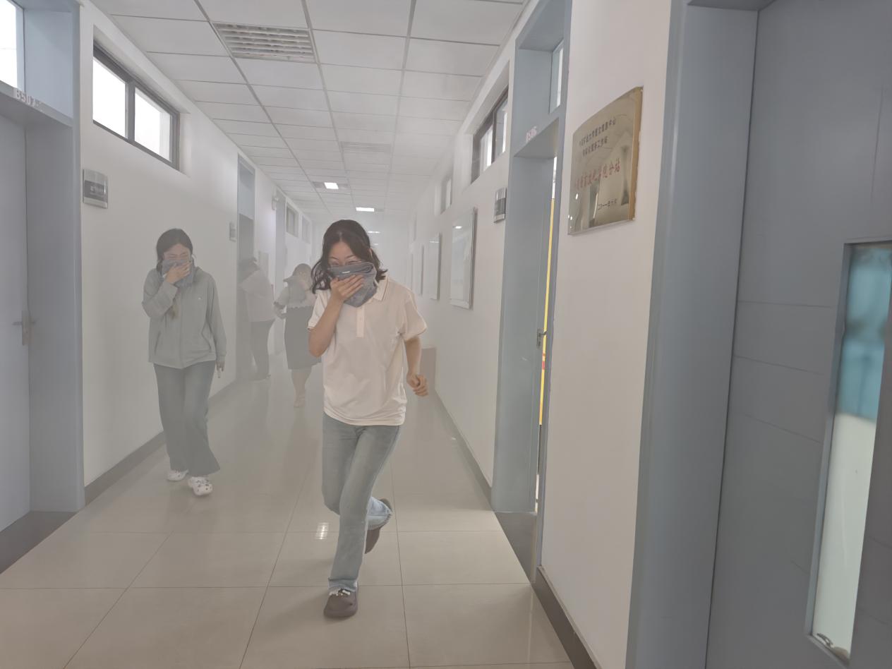 上午11时10分,随着一阵急促的消防警报声在公司楼内响起,演练正式启动。在模拟火灾场景中,工作人员在楼内迅速释放烟雾。师生们用湿毛巾捂住口鼻,弯腰低姿沿疏散指示标志从楼梯通道撤离。整个过程师生响应迅速、组织有序,达到了演练预期的效果。