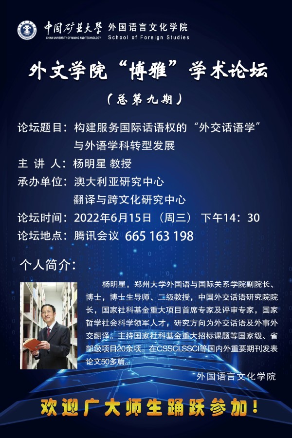 太阳成tyc122cc“博雅”学术沙龙(总第九期)构建服务国际话语权的“外交话语学”与外语学科转型发展