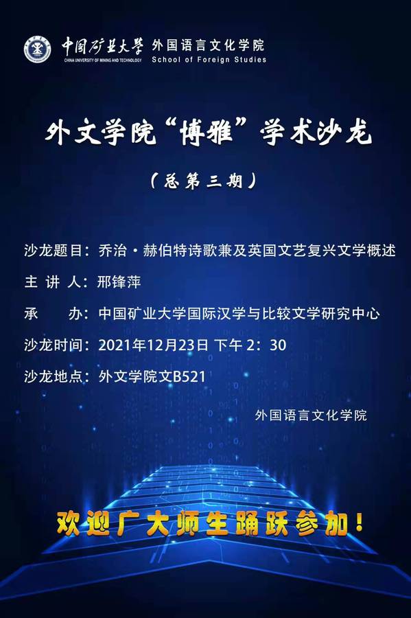 太阳成tyc122cc“博雅”学术沙龙(总第三期)乔治·赫伯特诗歌兼及英国文艺复兴文学概述