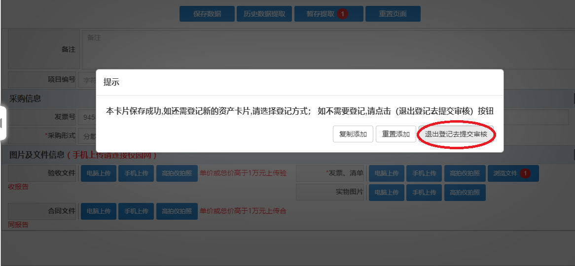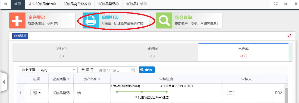 6)审核通过后,点击首页“单据打印”选择对应的资产入账单打印单据,单据分三联,第一联“财务记账联”需附在报销单后交财务处。