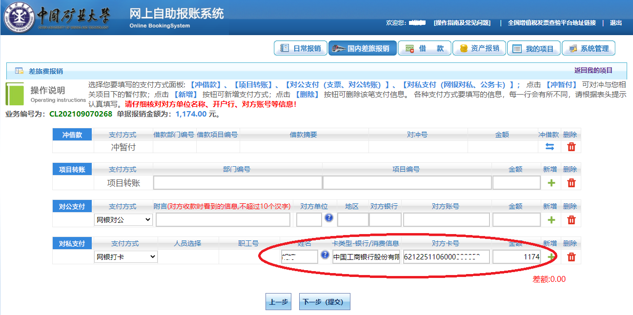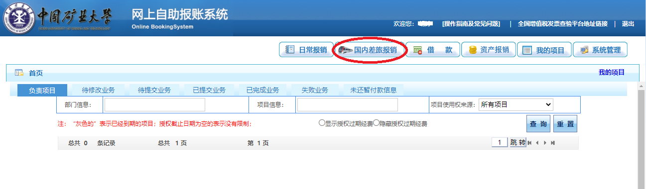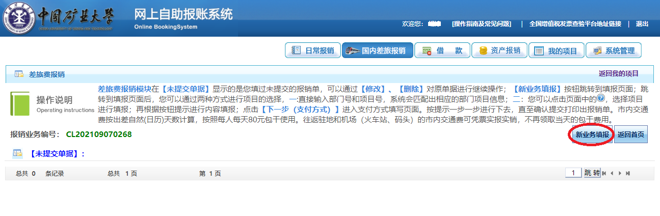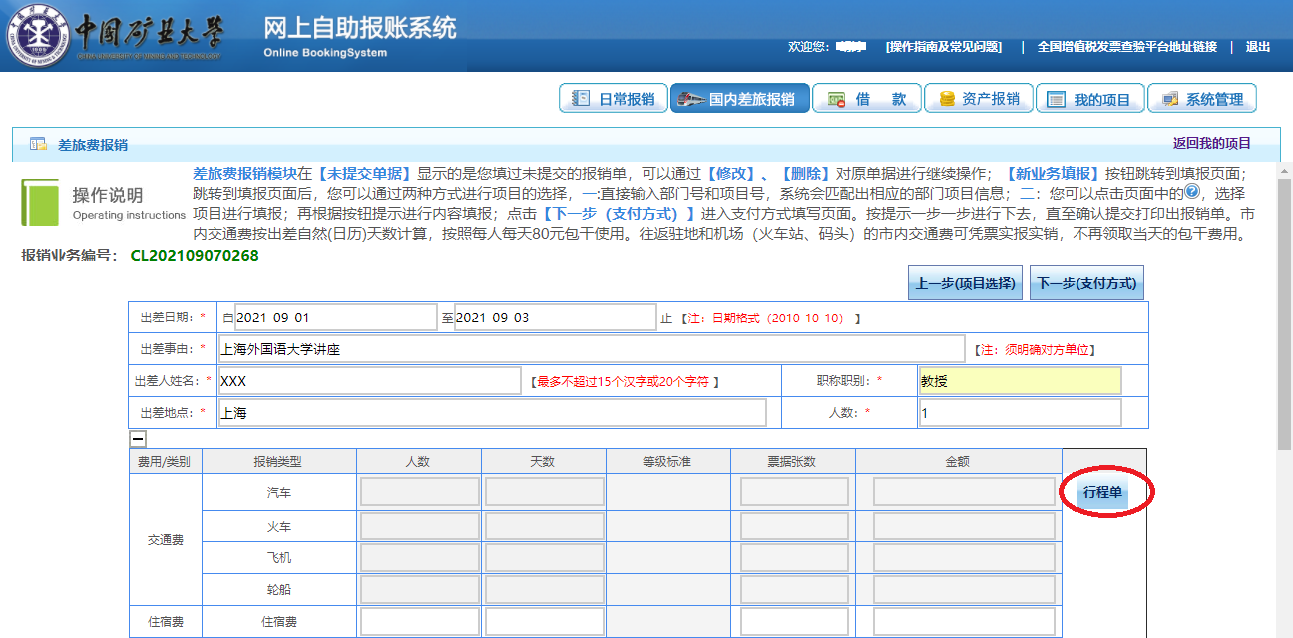 1)点击网上自助报账系统的“国内差旅报销”,“新业务填报”,输入“部门编号”、“项目编号”,并点击“下一步(差旅费用明细)”;