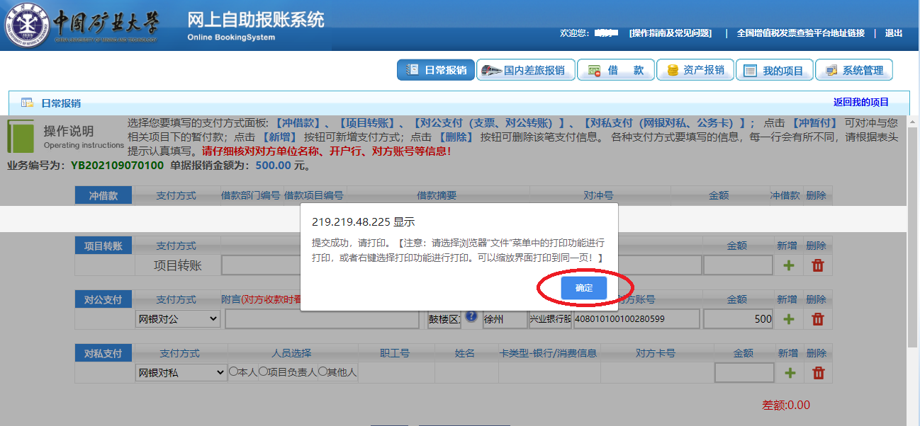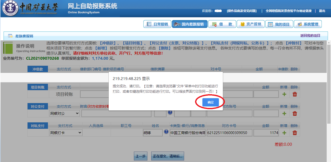 4)填写支付方式信息,点击“下一步(提交)”,点击“确定”提交并打印报销单;