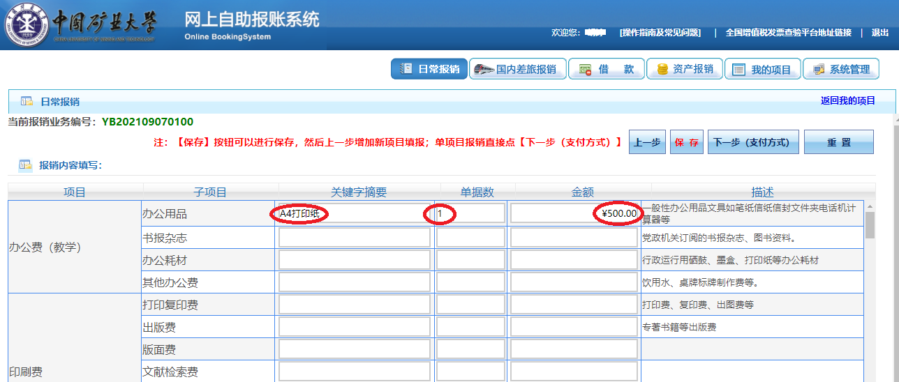 2)输入部门编码、项目编码,点击“下一步(报销费用明细)”;