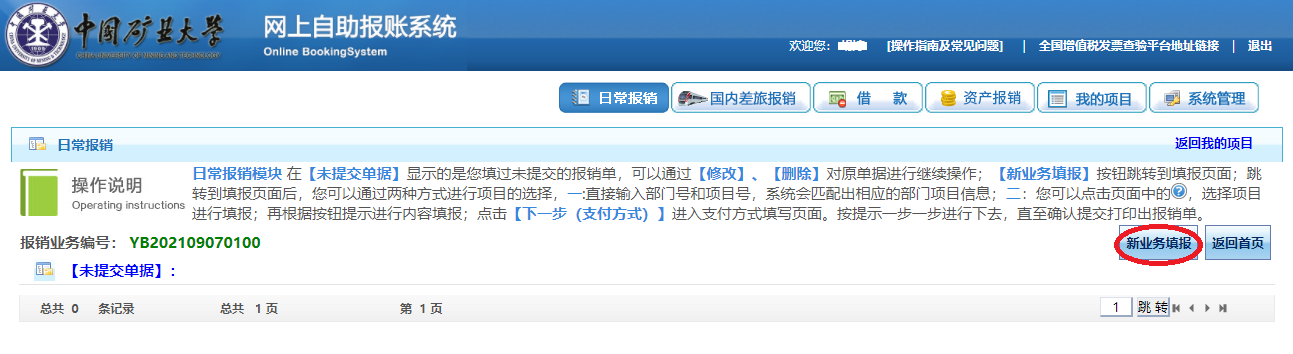1)从集团首页融合门户或者财务处网站(http://cwzcb.cumt.edu.cn/dlpt/Login.aspx)登录网上预约报账系统,点击“日常报销”,“新业务填报”;