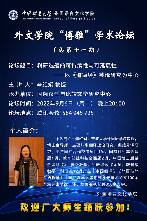 太阳成tyc122cc“博雅”学术论坛(总第十一期)科研选题的可持续性与可延展性——以《道德经》英译研究为中心