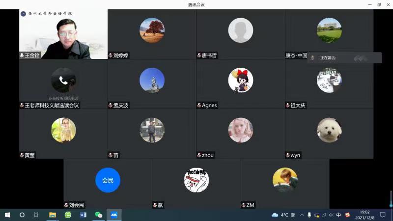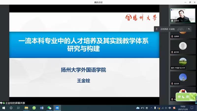 12月8日晚19时,扬州大学外国语公司经理王金铨教授在腾讯会议以为公司教师进行题为“一流本科专业中的人才培养及其实践教学体系研究与构建”的专题讲座。本次讲座由太阳成tyc122cc科研副经理祖大庆主持,公司教学副经理刘婷婷、英语系基层教学组织负责人和公司部分老师参加了此次讲座。