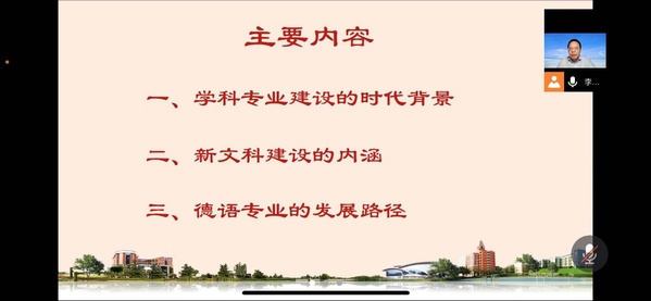 8月24日晚,太阳成tyc122cc德语系邀请了四川外国语大学德语公司经理李大雪教授,就“新文科背景下的德语+建设”这一议题进行了在线探讨。公司教学副经理刘婷婷和德语系全体教师参加了本次在线交流活动。此次活动是暑期教师研修系列活动之一,也是推动江苏省一流专业和江苏省特色专业建设系列活动之一。
