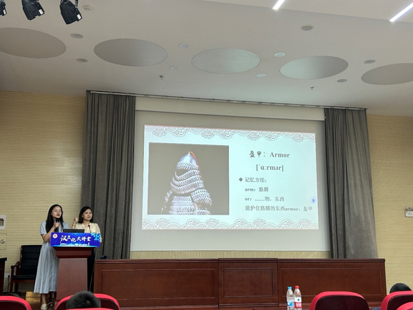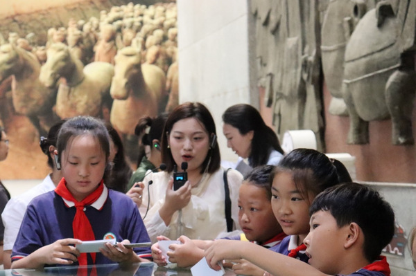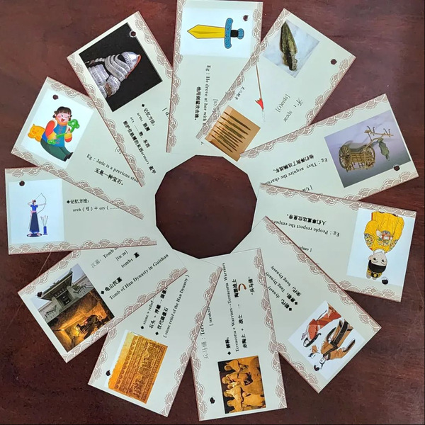 活动伊始,志愿者们为每个孩子提供了单词手卡,帮助孩子们在游览中记忆,在记忆中感受。在汉兵马俑博物馆中,讲解员带大家领略汉朝的军事风采,兵士俑们姿态各异、栩栩如生,正威严列阵、似蓄势待发。在活动体验区,小员工们体验了投壶、射箭的装备,让孩子们体验了一把“君子之艺”。临湖廊榭蔓回曲折,一面临景另一面置汉画石,石画线条刀刻斧凿,深深浅浅,明暗交织,诉说只有时光能听懂的故事。在汉文化大讲堂,汉学老师向大家普及了汉代礼仪知识,孩子们向老师行天揖礼,老师回土揖礼,一来一往,牵连起情谊,交织成传承的信念。随后,志愿者代表通过“词根/词缀+联想”记忆法,向孩子们讲解了汉文化相关英语词汇,引导孩子们将单词放入一定的语言环境,结合句意,高效记忆英语词汇。在参观过程中,志愿者们也同时采集景区不规范的标识翻译,以期规范徐州汉文化景区的标识翻译。